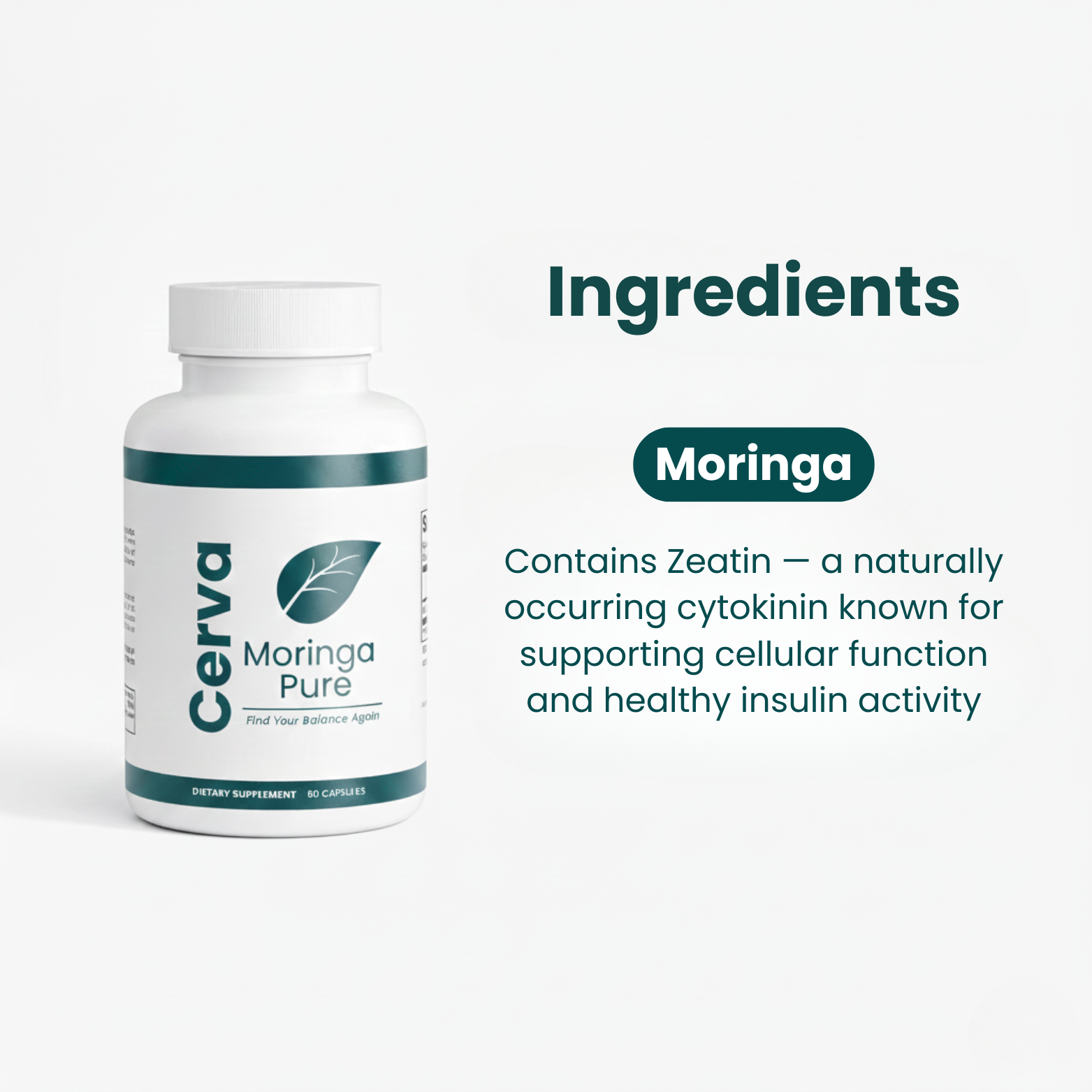 Cerva is formulated with Zeatin, a naturally occurring compound in moringa that supports healthy insulin signaling and cellular balance, helping your body manage glucose more efficiently and maintain steadier blood sugar levels throughout the day.